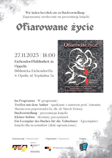 DFK Opole-Centrum zaprasza na prezentację książki pt. „Ofiarowane życie - posługa i męczeństwo błogosławionych sióstr Paschalis Jahn i IX Towarzyszek ze Zgromadzenia Sióstr św. Elżbiety w 1945 r.” autorstwa pana prof. Antoniego Maziarza, która odbędzie się w czwartek, 27 listopada, o godz. 18.00 Centralnej Bibliotece im. Josepha von Eichendorffa (ul. Szpitalna 7a).