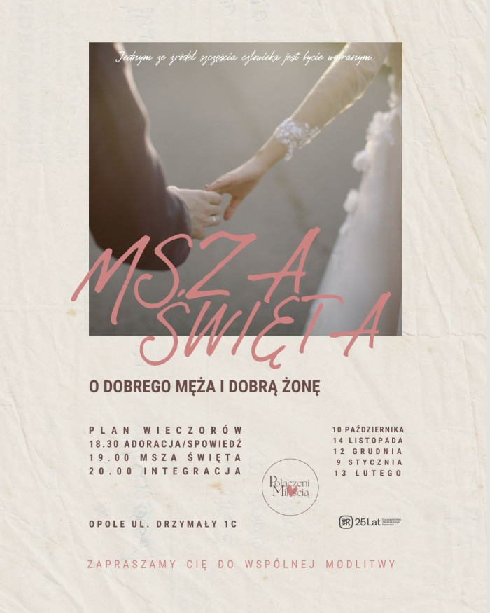 Ks. Łukasz Knosala, diecezjalny duszpasterz akademicki, oraz wspólnota „Połączeni Miłością Opole” zapraszają na comiesięczne Msze św. w intencji o dobrego męża i żonę, które odbywać się będą w kaplicy Duszpasterstwa Akademickiego Resurrexit w Opolu w każdy drugi piątek miesiąca o godz. 19.00.