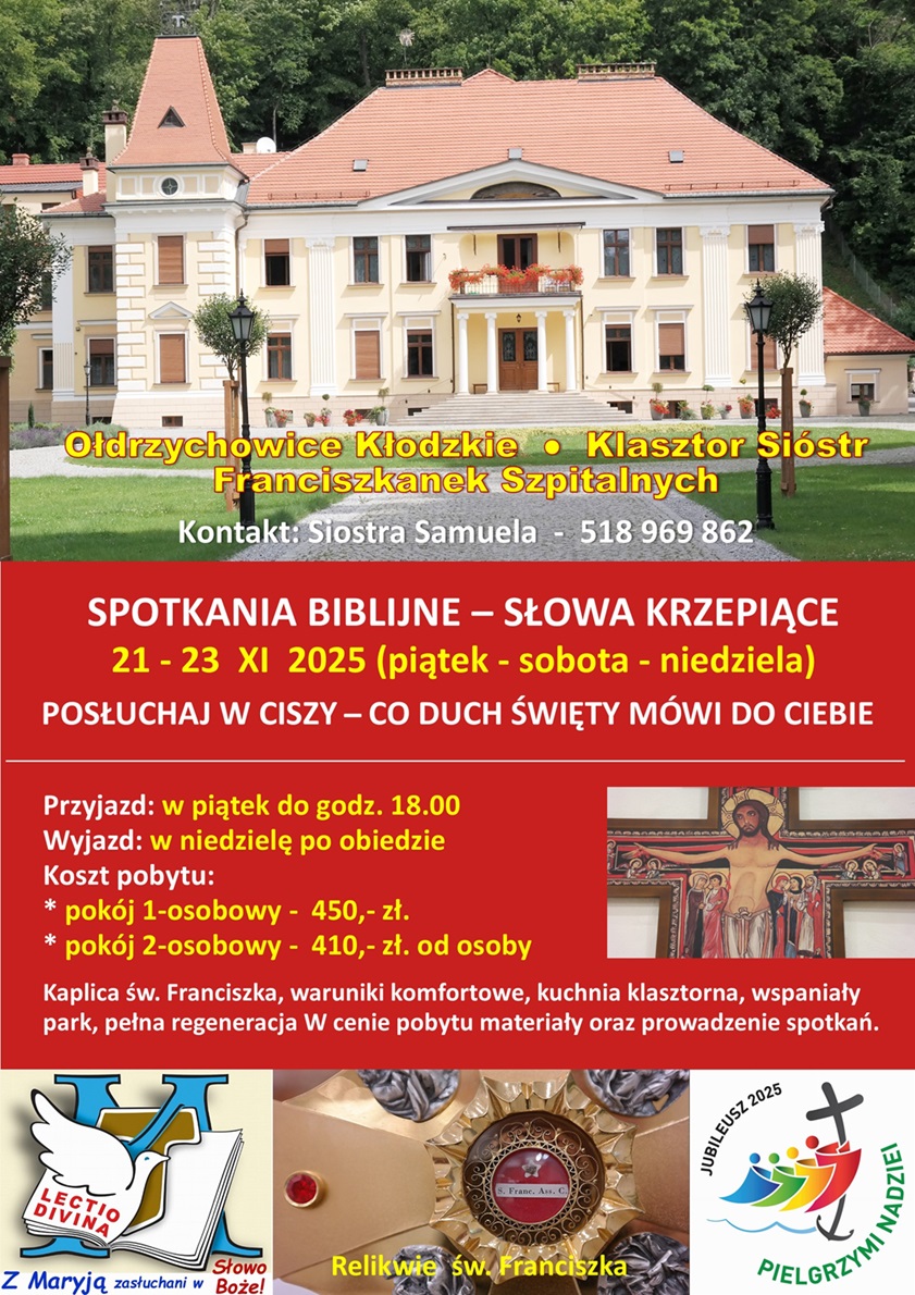Ks. Piotr Tarlinski i s. M. Samuela Brodacka OSF zapraszają na spotkania biblijne „Słowa Krzepiące”, które odbędą się w dniach 21-23 listopada (piątek - niedziela) w klasztorze Sióstr Franciszkanek Szpitalnych w Ołdrzychowicach Kłodzkich.