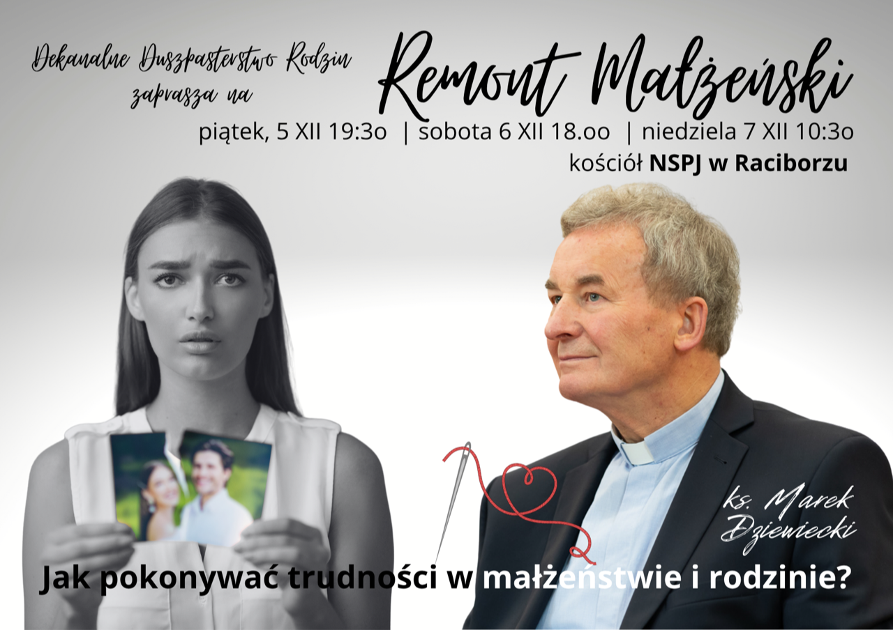 Duszpasterstwo Rodzin dekanatu Racibórz zaprasza na „Remont Małżeński”, czyli adwentowe rekolekcje, które w dniach 5-7 grudnia poprowadzi ks. Marek Dziewiecki, członek Zespołu KEP ds. Apostolstwa Trzeźwości i Osób Uzależnionych.