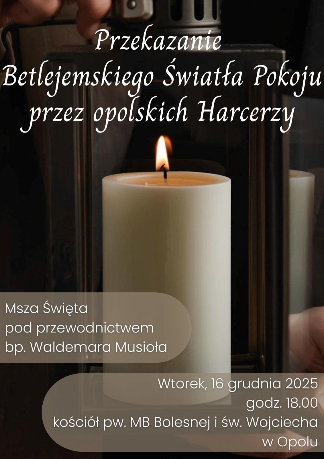 Centralne wydarzenie związane z przekazaniem Światła Pokoju, odbędzie się we wtorek 16 grudnia podczas Mszy św. roratniej sprawowanej o godz. 18.00 w kościele pw. Matki Bożej Bolesnej i św. Wojciecha w Opolu (na Górce). Liturgii przewodniczyć będzie bp Waldemar Musioł.