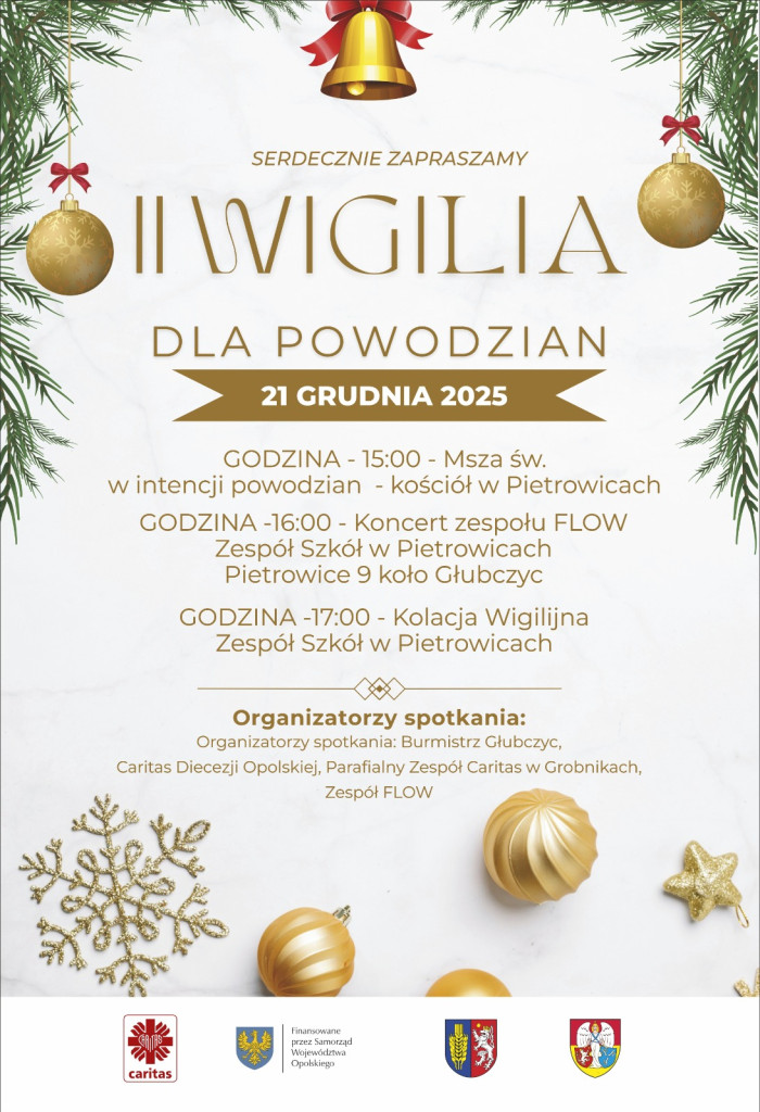 Caritas Diecezji Opolskiej, Burmistrz Głubczyc i Parafialny Zespół Caritas w Grobnikach wraz z ks. proboszczem Danielem Kasprzakiem zapraszają wszystkich dotkniętych zeszłoroczną powodzią do udziału w spotkaniu wigilijnym, które odbędzie się w niedzielę 21 grudnia w Pietrowicach Głubczyckich.