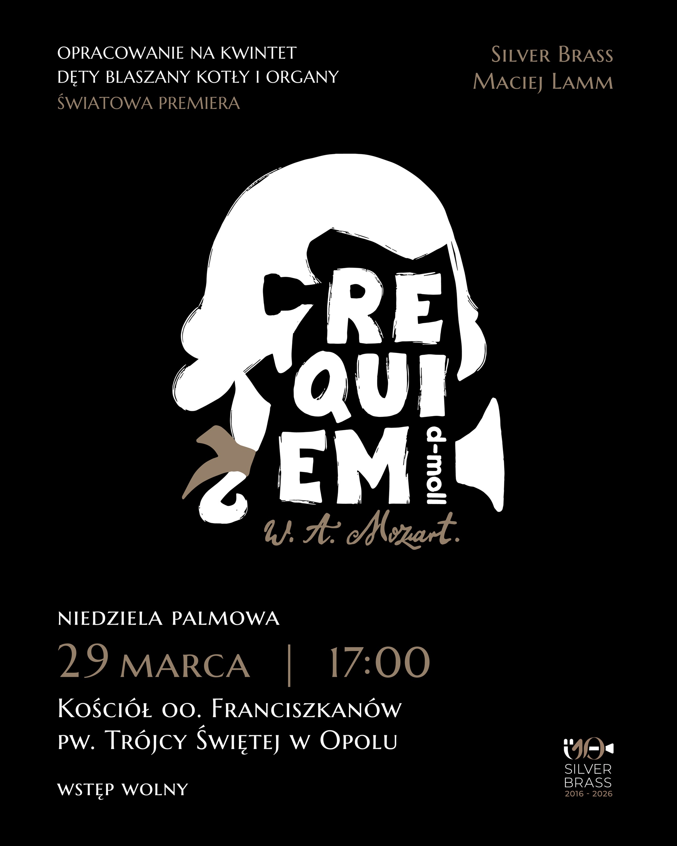 Ojcowie Franciszkanie z Opola zapraszają na koncert, podczas którego zabrzmi światowa premiera „Requiem d-moll” Wolfganga Amadeusza Mozarta w opracowaniu na kwintet dęty blaszany, kotły i organy. Wystąpi zespół Silver Brass, który obchodzi 10-lecie działalności. Koncert odbędzie się w niedzielę 29 marca o godz. 17.00 w kościele pw. Trójcy Świętej (u Ojców Franciszkanów) w Opolu.