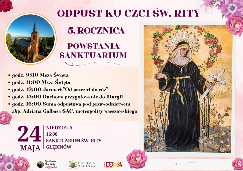 Ks. Przemysław Seń, kustosz Sanktuarium św. Rity w Głębinowie, zaprasza do udziału w uroczystościach odpustowych ku czci św. Rity, które będą miały miejsce 22 i 24 maja. Tegoroczne uroczystości odpustowe zbiegają się z 5. rocznicą ustanowienia Sanktuarium św. Rity w Głębinowie.