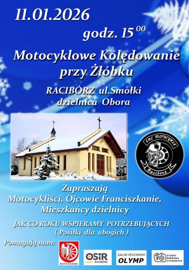 Raciborscy motocykliści, Ojcowie Franciszkanie i mieszkańcy raciborskiej dzielnicy Obora zapraszają na wspólne kolędowanie, które odbędzie się w niedzielę 11 stycznia o godz. 15.00 w kościele pw. Matki Bożej Anielskiej w Raciborzu-Oborze. W czasie kolędowania będzie można wesprzeć Siostry ze Zgromadzenia Misyjnego Służebnic Ducha Świętego, które przygotowują posiłki dla ubogich.
