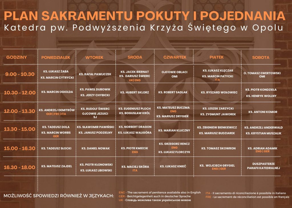 • o. Damian Dybała OMI, proboszcz parafii św. Jana Pawła II w Opolu, podejmuje posługę w konfesjonale w opolskiej katedrze (na czas zamknięcia katedry sakrament pokuty i pojednania w ramach „diecezjalnego konfesjonału” odbywa się w kościele Ojców Franciszkanów w Opolu) i w swojej parafii;
