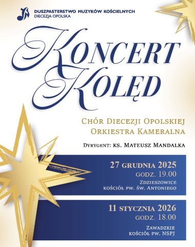 Duszpasterstwo Muzyków Kościelnych Diecezji Opolskiej zaprasza na dwa koncerty kolęd w wykonaniu Chóru Diecezji Opolskiej i Orkiestry Kameralnej. Pierwszy z nich odbędzie się w sobotę 27 grudnia br. o godz. 19.00 w kościele pw. św. Antoniego w Zdzieszowicach, drugi natomiast w niedzielę 11 stycznia 2026 r. o godz. 18.00 w kościele pw. NSPJ w Zawadzkiem.