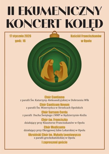 W sobotę 17 stycznia 2026 r. o godz. 16.00 w kościele Ojców Franciszkanów w Opolu odbędzie się II Ekumeniczny Koncert Kolęd, podczas którego wystąpią m.in. Chór Cantiamo z parafii św. Katarzyny Aleksandryjskiej w Dobrzeniu Wielkim, Chór Canticum Novum z parafii św. Wawrzyńca w Strzelcach Opolskich i Chór Sursum Corda z parafii Ducha Świętego i NMP Matki Kościoła w Kędzierzynie-Koźlu (Piasty).