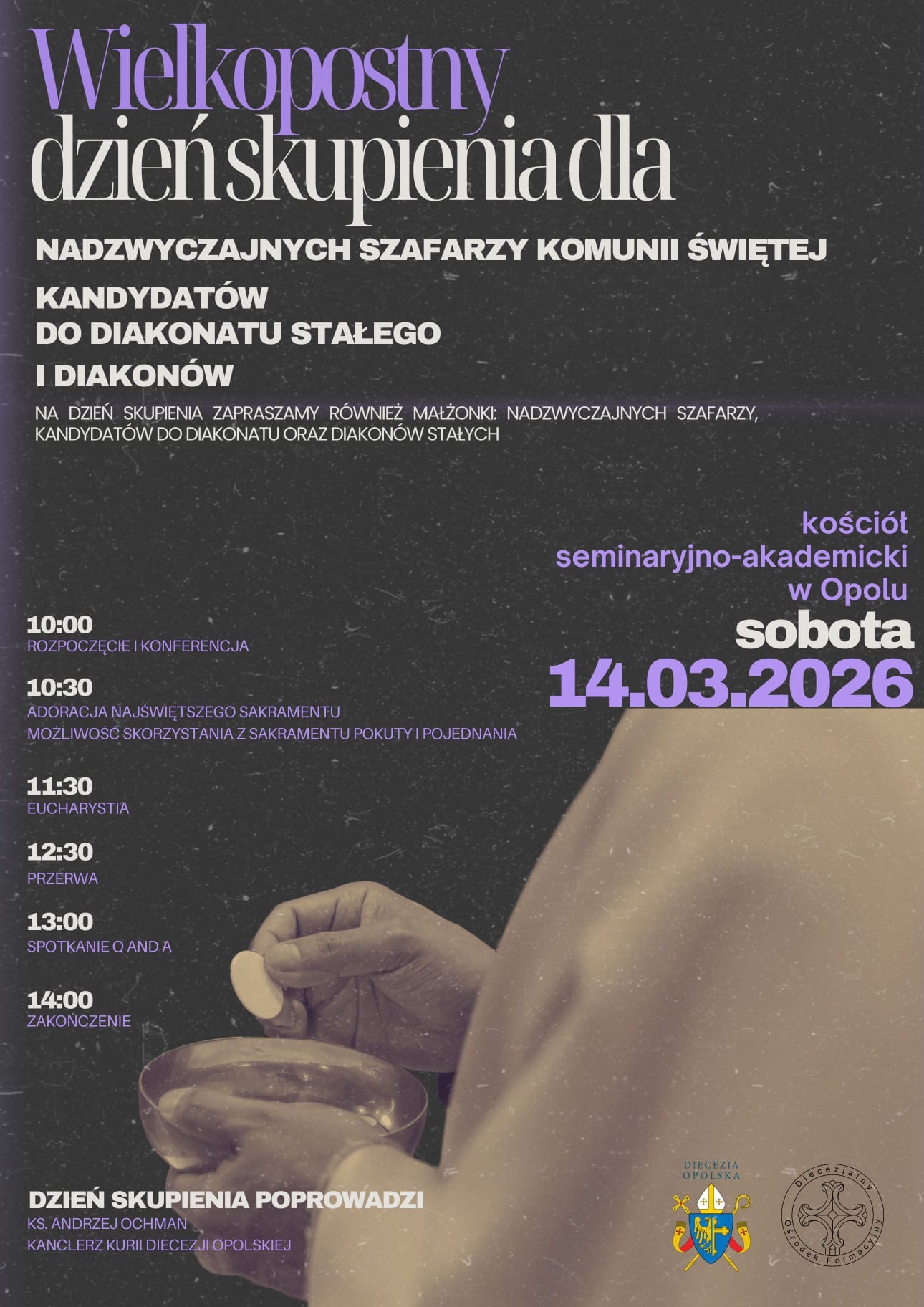 Diecezjany Ośrodek Formacyjny w Opolu zaprasza Nadzwyczajnych Szafarzy Komunii Świętej, Kandydatów do Diakonatu Stałego i Diakonów Stałych na wielkopostny dzień skupienia, który odbędzie się w sobotę 14 marca w kościele seminaryjno-akademickim w Opolu. Na to wydarzenie zapraszone są również małżonki Nadzwyczajnych Szafarzy Komunii Świętej, Kandydatów do Diakonatu Stałego i Diakonów Stałych.