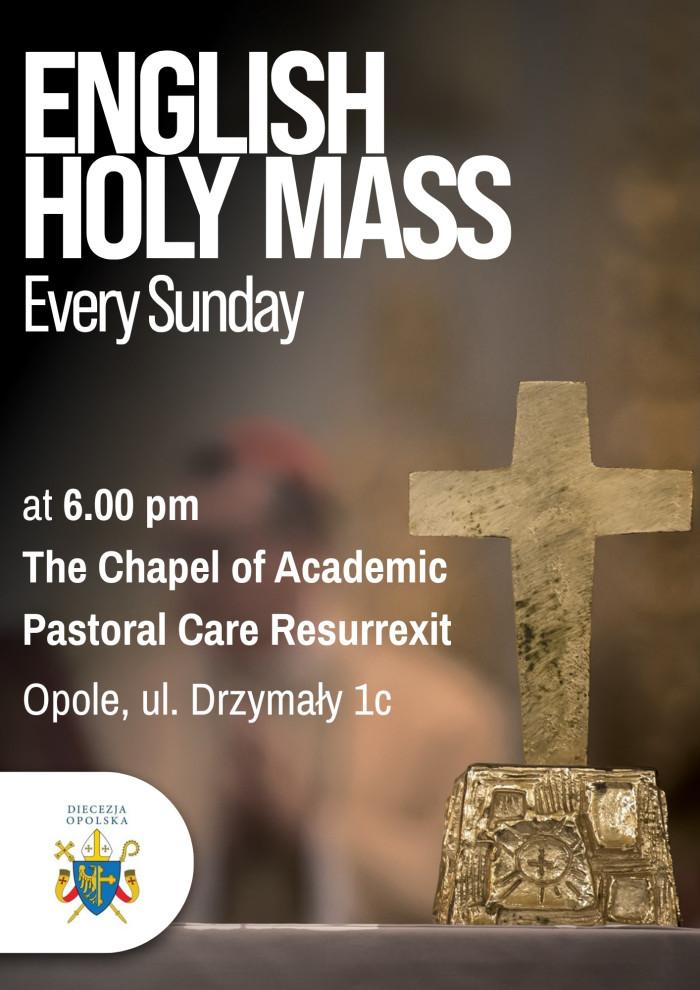 Począwszy od 5 października 2025 r., z myślą o osobach posługujących się językiem angielskim, a zwłaszcza o studentach z innych krajów i migrantach zarobkowych, w każdą niedzielę o godz. 18.00 w kaplicy Duszpasterstwa Akademickiego Resurrexit (pod kościołem seminaryjno-akademickim w Opolu), będzie sprawowana Msza św. w języku angielskim.