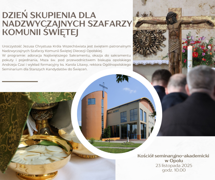 Biskup Opolski zaprasza wszystkich Nadzwyczajnych Szafarzy Komunii Świętej do udziału w dorocznym dniu skupienia, który odbędzie się w Uroczystość Jezusa Chrystusa Króla Wszechświata, 23 listopada. Skupienie rozpocznie się o godz. 10.00 w kościele seminaryjno-akademickim w Opolu (ul. Drzymały 1a).