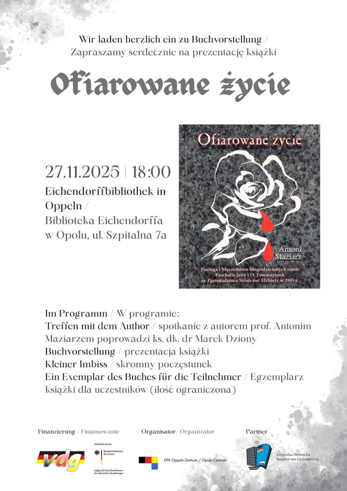 DFK Opole-Centrum zaprasza na prezentację książki pt. „Ofiarowane życie - posługa i męczeństwo błogosławionych sióstr Paschalis Jahn i IX Towarzyszek ze Zgromadzenia Sióstr św. Elżbiety w 1945 r.” autorstwa pana prof. Antoniego Maziarza, która odbędzie się w czwartek, 27 listopada, o godz. 18.00 Centralnej Bibliotece im. Josepha von Eichendorffa (ul. Szpitalna 7a).