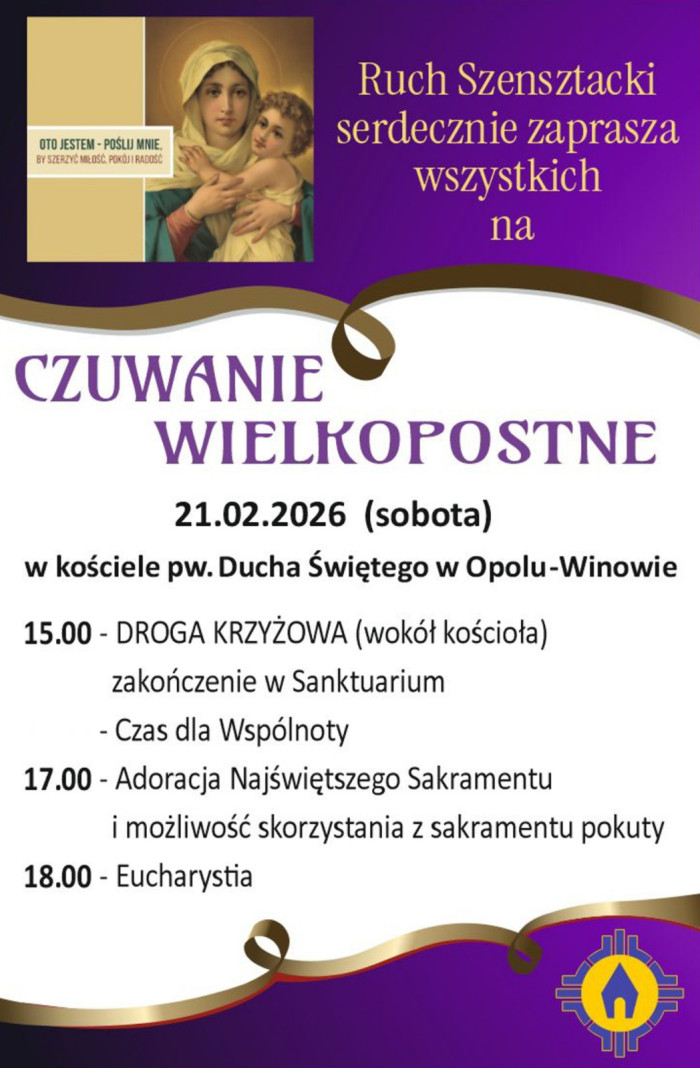 Ruch Szensztacki z diecezji opolskiej zaprasza wszystkich chętnych na czuwanie wielkopostne, które odbędzie się w sobotę 21 lutego br. w kościele parafialnym pw. Ducha Świętego w Opolu-Winowie.