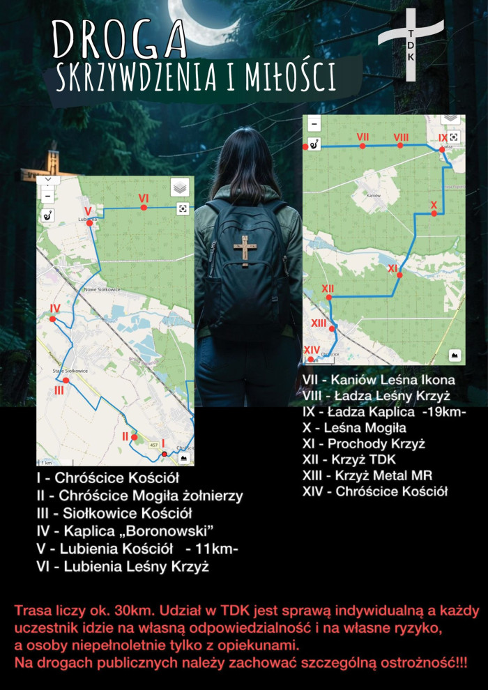 Po Eucharystii uczestnicy wyruszą w około 30-kilometrową nocną wędrówkę leśnymi drogami, przeżywaną w ciszy i skupieniu. Trasa poprowadzi przez okoliczne miejscowości: Siołkowice, Lubienię, Kaniów i Ładzę. Zakończenie drogi planowane jest około godz. 4.00 nad ranem.