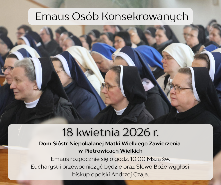 S. Jolanta Radomyska SSpS, referentka sióstr zakonnych, oraz o. Błażej Kurowski OFM, wikariusz biskupi ds. życia konsekrowanego, zapraszają wszystkie Osoby Konsekrowane naszej diecezji do udziału w Emaus Osób Konsekrowanych.