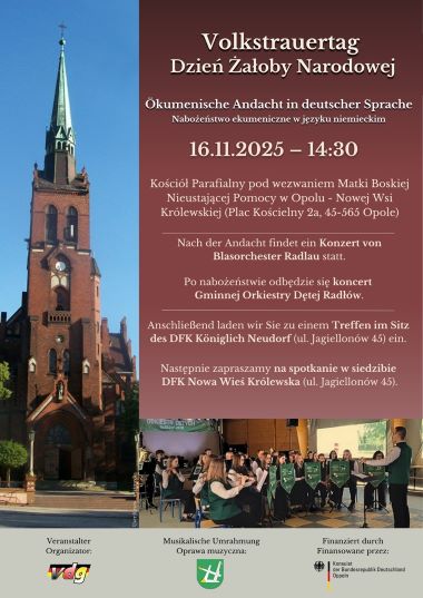 Związek Niemieckich Stowarzyszeń Społeczno-Kulturalnych w Polsce zaprasza na ekumeniczne nabożeństwo w intencji ofiar wojen i przemocy, które z okazji dnia żałoby narodowej (Volkstrauertag) zostanie odprawione w niedzielę, 16 listopada, o godz. 14.30 w kościele pw. Matki Boskiej Nieustającej Pomocy w Opolu - Nowej Wsi Królewskiej.