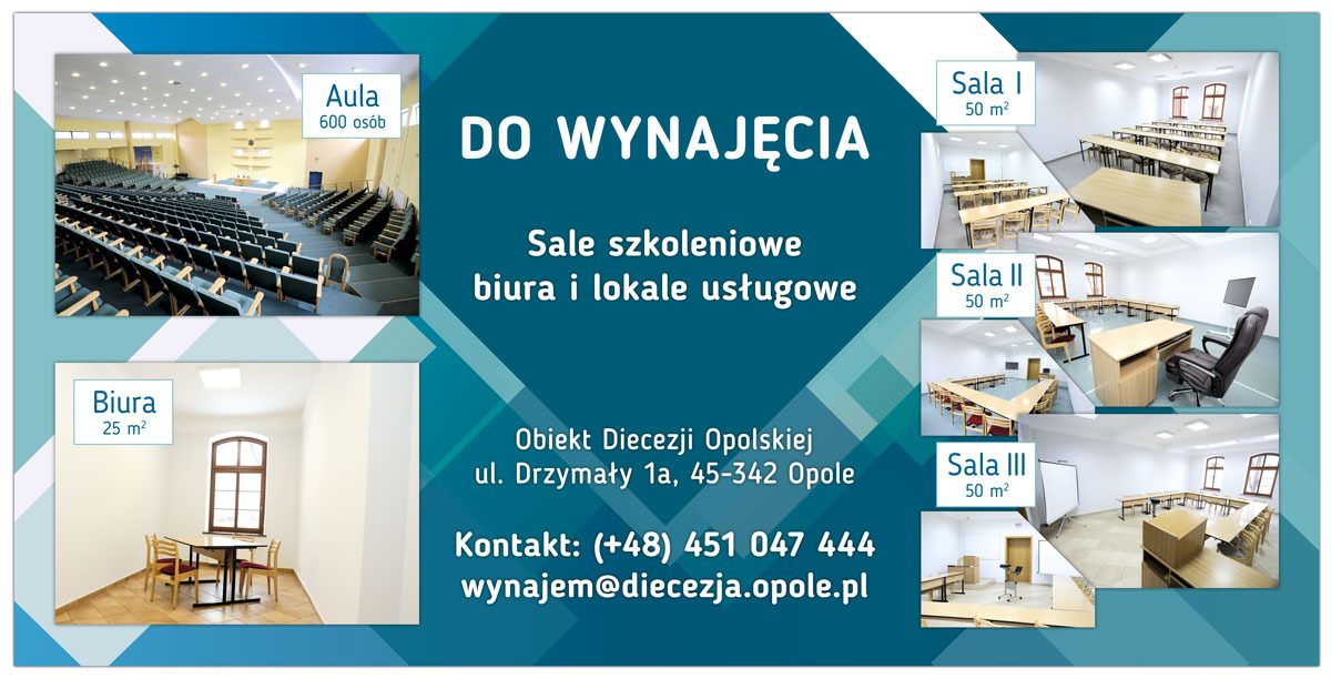 Diecezja Opolska oferuje wynajem pomieszczeń dla usług edukacyjnych, biurowych, szkoleniowych, a także do wykorzystania przez inne podmioty usługowe np. usługi rehabilitacyjne, kosmetyczne.